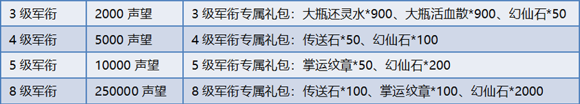 新服【天上人间】【仙境奇缘】的玩家通过正常游戏行为获得声望值,达到3级军衔、4级军衔、5级军衔、8级军衔时可在祖龙城南仓库对面NPC声望使者 诸葛小小处领取军衔助力礼包。